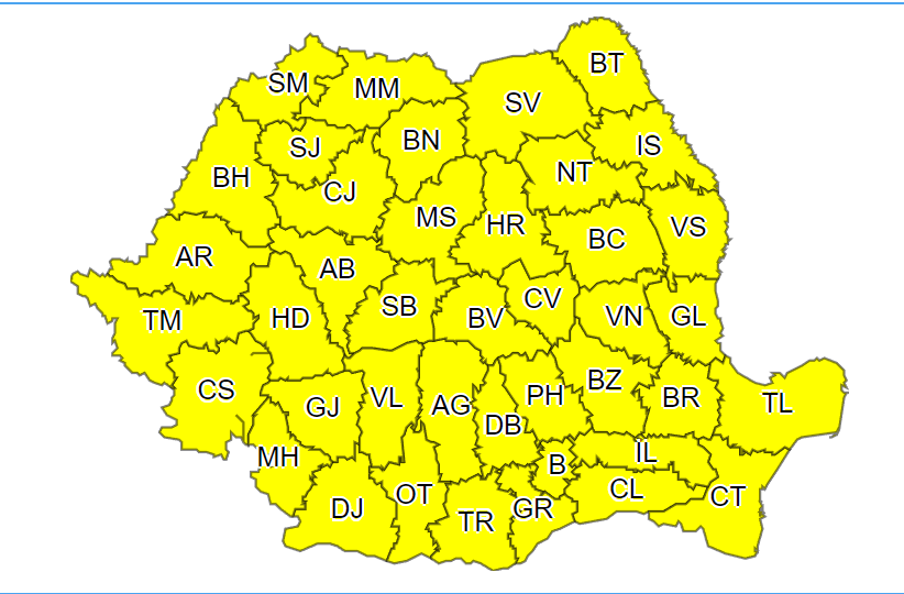 Administrația Națională de Meteorologie a emis, vineri, o atenționare cod galben de caniculă, valabilă în zilele de 26 și 27 august în toată țara.
