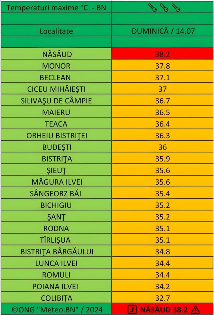 Sursa citată precizează că valorile termice au urcat, duminică, la ora 16:20, până la 38,2°C la Năsăud.